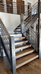 Custom stair treads bring warmth and structure to the space, grounding the home with natural material and craftsmanship. The wood’s character adds movement and dimension, creating a seamless transition between levels while elevating the entire interior.