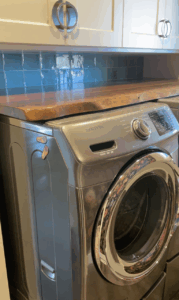 Custom Black Walnut shelving in the laundry room adds warmth and continuity while maximizing storage. Instead of treating the space as an afterthought, this above-unit shelf helps carry the home’s overall aesthetic into every corner. It’s proof that functional spaces can still feel custom and curated.