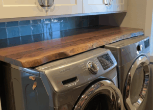 We installed rich Black Walnut countertops paired with custom built-in benches, transforming the space into something far beyond practical. Alongside the colorful wallpaper, the Walnut’s deep tones add sophistication, while its strength ensures these high-traffic surfaces stand the test of time. The result is a mudroom that feels intentional, elevated, and cohesive with the rest of the home.